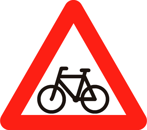 Advarer om, at cyklister og knallertkørere kører ud på kørebanen eller krydser den.