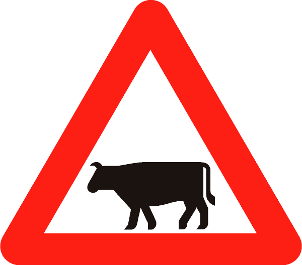 Advarer om daglig passage af kreaturer på steder med dårlig oversigt, og at kørebanen ofte kan være glat eller fedtet.