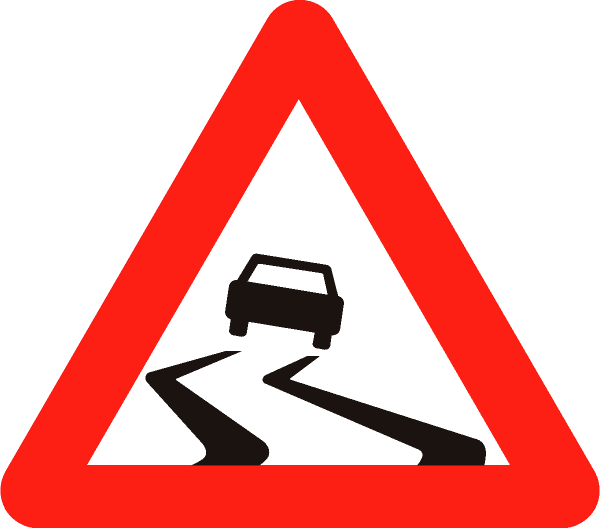Advarer om, at kørebanen kan være unormalt glat. Årsagen skal angives på undertavle, fx »Glat i vådt føre«