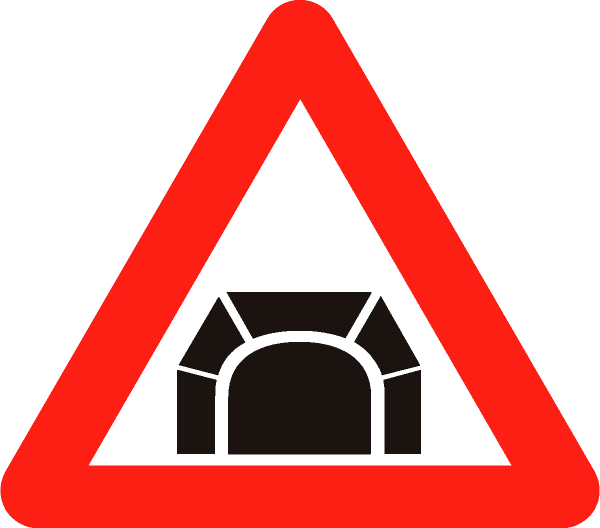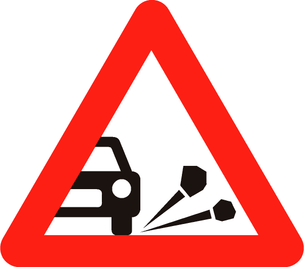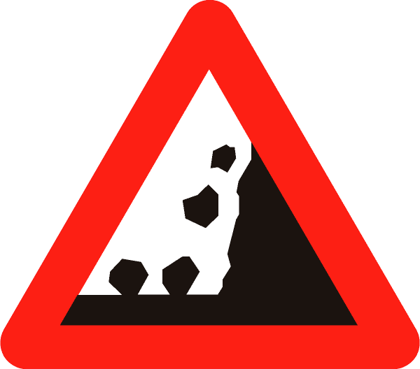 Angiver, at der er fare for nedfaldne sten på kørebanen.