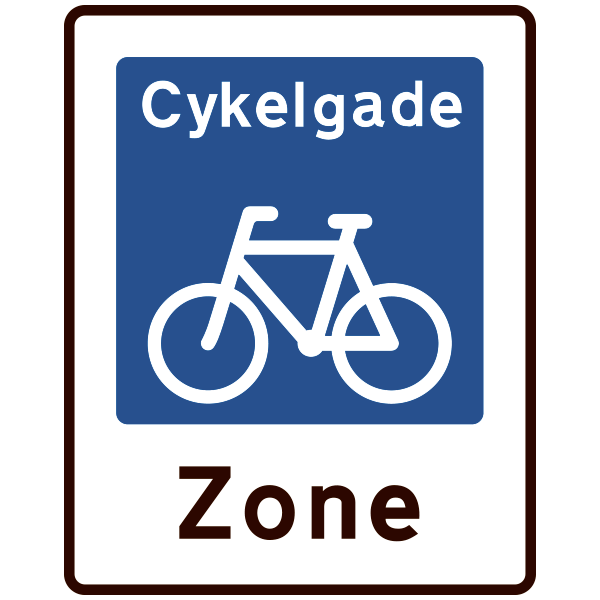 Angiver et område, hvor der gælder særlige færdselsregler. En evt. tilladelse til kørsel angives med undertavle, og gælder evt. særlige færdselsarter. Hastigheden skal afpasses de øvrige på området normalt max. 30 km/t. Parkering i en cykelgade må ikke ske uden for særligt afmærkede pladser.